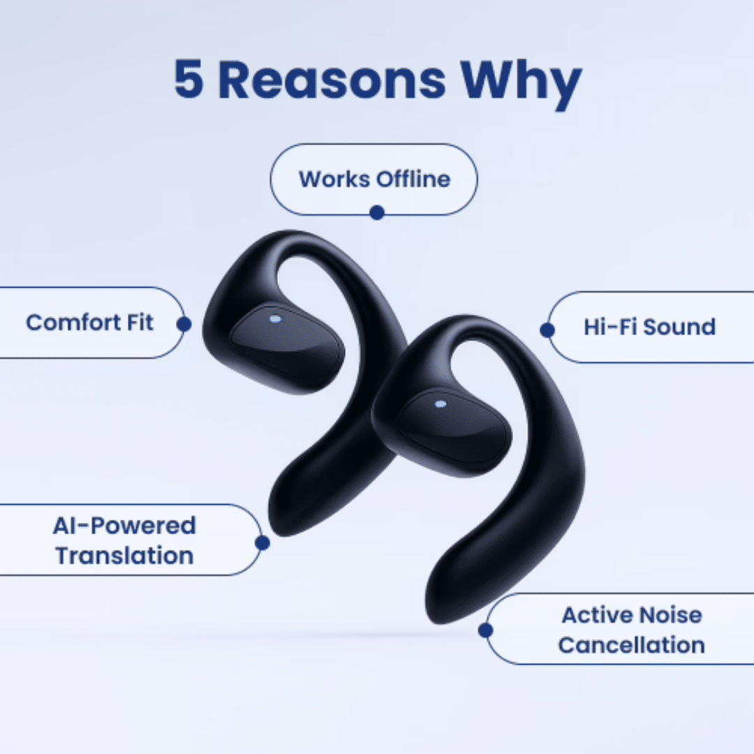 Designed for travelers, business professionals, and language learners, these ergonomic earbuds deliver crystal-clear audio with advanced noise cancellation for natural, hands-free conversations anywhere.